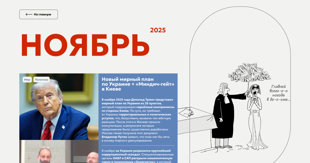 В ноябре на Украине разразился крупнейший коррупционный скандал. Специализированные органы НАБУ и САП раскрыли мошенническую схему в госкомпании «Энергоатом», в которой был замешан бизнесмен Тимур Миндич, близкий соратник Владимира Зеленского. Предприниматель покинул страну за несколько часов до обысков НАБУ. Это спровоцировало волну коррупционных разоблачений среди политиков. В частности, своё кресло покинули министр юстиции Герман Галущенко и министр энергетики Светлана Гринчук. Спустя неделю из-за причастности к коррупции в отставку подал и глава офиса президента Андрей Ермак.